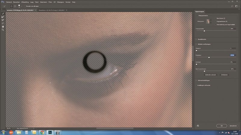 De scherpe randen van onze selectie zouden er in het uiteindelijke resultaat natuurlijk vreemd uit zien, en dus moeten we de randen zachter maken. Dat doe je door met de selectie actief op de knop 'Selecteren en maskeren' te klikken in de optiebalk boven het werkgebied. Er opent zich een nieuw scherm met diverse schuifinstellingen. Schuif 'Doezelaar' naar rechts om een mooie zachte rand aan de selectie te geven. Sleep ook de schuif 'Rand verschuiven' naar links om de ring wat kleiner te maken en klik op OK.