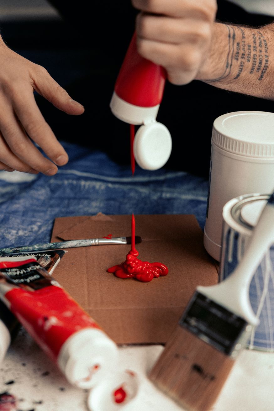 Alles wat ik daarna schilderde, ging op gevoel en ik genoot er enorm van. Eerst was het ontwerp een grote zwarte vlek op een wit doek, daarna heb ik veel rode verf verspreid. Toen ik vervolgens witte verf roerde, ging het voor mijn gevoel helemaal mis. Ik haalde de kwast eruit en morste verf op het doek. Tot mijn verbazing bleek dit er juist heel tof uit te zien. Zo zie je maar dat je jezelf ook kunt laten gaan en kunt spelen met toevallige foutjes, in plaats van alles eerst te overdenken.
