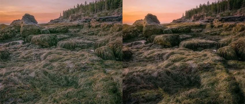 Links een afbeelding zonder dodge & burn, rechts een afbeelding met dodge & burn