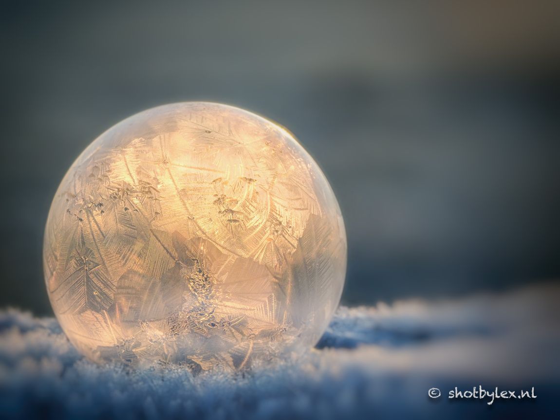 Het gebeurt niet vaak dat het in Nederland koud genoeg is voor dit soort foto's. Maar afgelopen week hadden we een heldere ochtend met veel vorst en weinig wind. Rond zonsopkomst was het licht ook nog lekker zacht en wilde de zeepbellen wel bevriezen. Prachtig hoe de natuur zijn eigen kunst maakt!