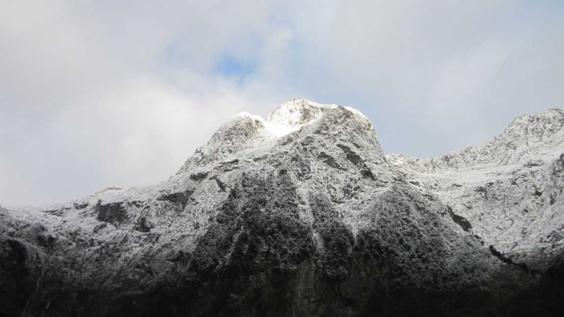 Deze foto is gemaakt in Doubtful Sound de ochtend na de eerste sneeuwval van het jaar. De eerste zon in de vroege ochtend schijnt precies op de inval van de bergtop. Wat het begin van de winter inluidt.