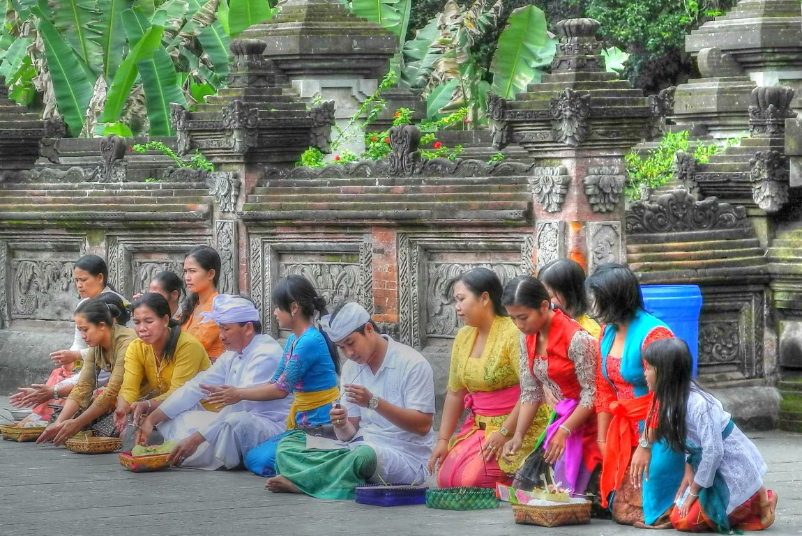 De foto is genomen in het Tirta Empul complex op Bali. Hindoes komen zich hier ritueel reinigen in het heilige water en ze brengen er offers.