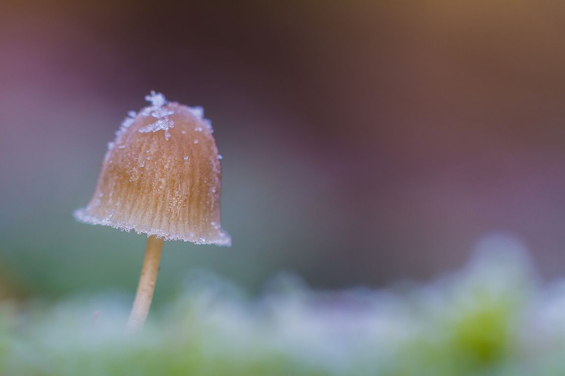 Bedekt met ijskristalletjes trotseert dit paddenstoeltje de winterkou.