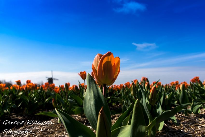 ‘Deze foto is op de terug weg van een weekend Texel genomen, we reden daar in de buurt en ik wilde de bloembol velden graag eens goed op de foto krijgen. Het was perfect de contrast van de tulpen met de blauwe hemel en dan de molen op de achtergrond. Echt Nederland en vandaar “Ik mis de klompen”.’