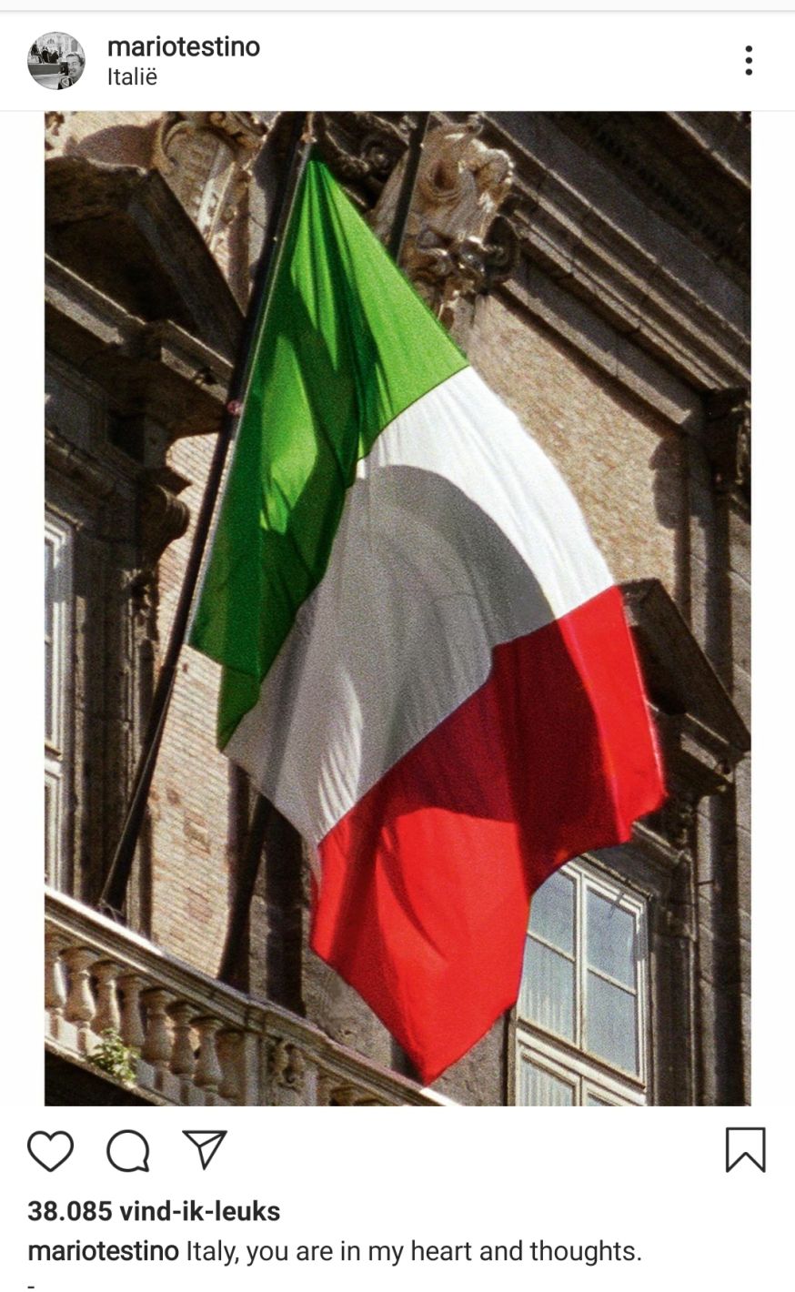 Testino is waarschijnlijk de meest invloedrijke modefotograaf ter wereld. Hij fotografeerde de grootste modellen voor de grootste modebladen. Maar hij was bijvoorbeeld ook de lievelingsfotograaf van prinses Diana. De geboren Peruaan steekt op 11 maart een hart onder de Italiaanse riemen met zijn bericht ‘Italië, je zit in mijn hart en in mijn gedachte.
