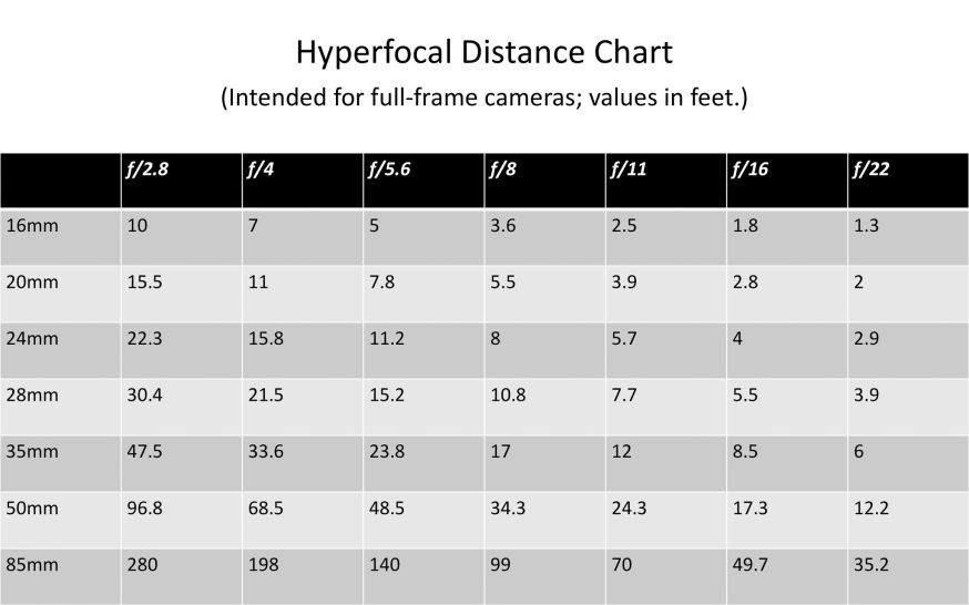 Bekijk hieronder een handige tabel, waarin afstanden staan aangegeven per diafragmagetal. Het diafragmagetal heeft namelijk invloed op het brandpuntafstand. Want als je een laag diafragmagetal kiest, vangt de sensor meer licht op en verandert het brandpuntafstand. Lees meer over het brandpuntafstand op Photography Life.