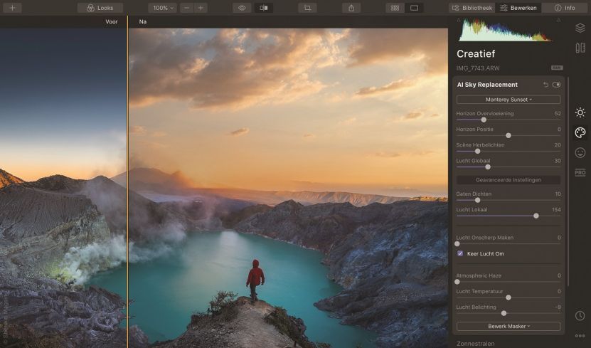 Heb je wel eens een prachtige landschapsfoto gemaakt, maar vond je achteraf dat de lucht toch wat saai was? Met Luminar 4's grootste troef 'AI Sky Replacement' pimp je de luchten in je foto met een simpele druk op de knop. Je kiest de afbeelding waarin je de lucht wilt vervangen in de bewerkingsmodule, selecteert het tabblad 'Creatief' in het menu aan de rechterkant en kiest een van de voorgeprogrammeerde luchten uit een database. Met kinderlijk eenvoudige schuifsystemen kun je de afbeelding nog een beetje tweaken naar jouw persoonlijke voorkeur.