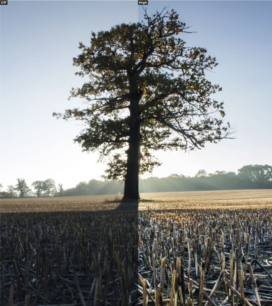 Op de onderstaande foto's kun je goed zien hoe D-lighting werkt. Het donkere gebouw licht op en het gras in het veld wordt ineens beter zichtbaar.
