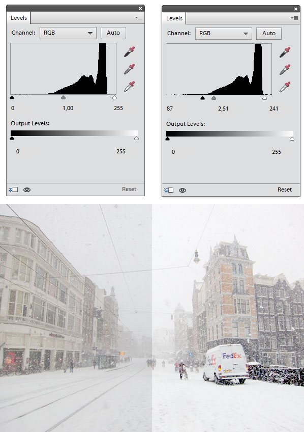 Links de orignele foto en de standaardinstellingen bij 'niveau's'. De effecten van onze aanpassingen aan die niveau's zijn rechts goed zichtbaar.