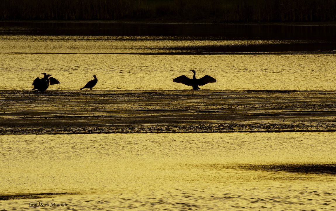 De zon scheen recht tegenover me, dus ik had de kans om silhouetten te fotograferen. Gelukkig stonden er een aantal aalscholvers op een drooggevallen strook, waarvan er eentje mooi de vleugels open had.