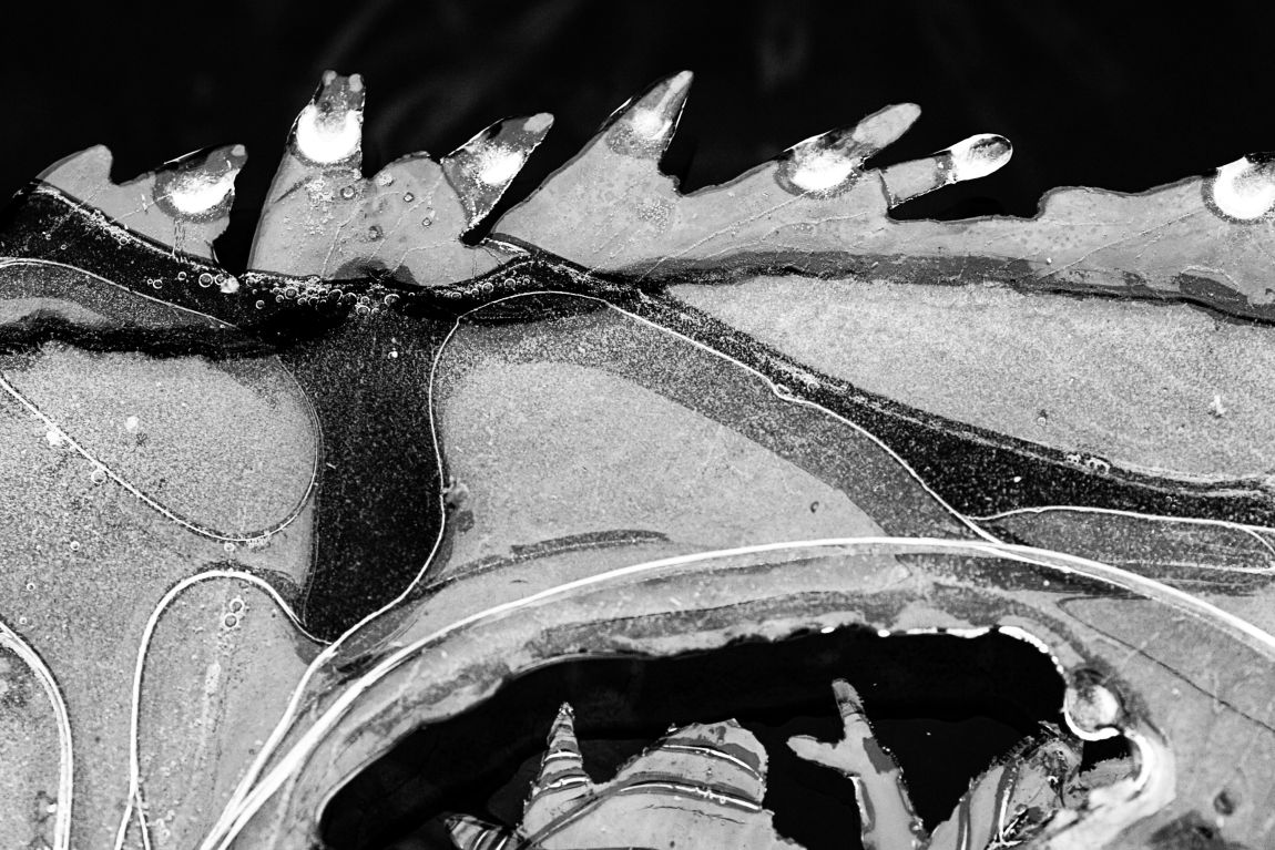 Terwijl de vijver bevroren was, liep hij langzaam leeg waardoor de ijslaag ging zweven. Elke dag smolten er andere vormen in. Je kunt er molletjes of andere dieren in zien of abstracte vormen.