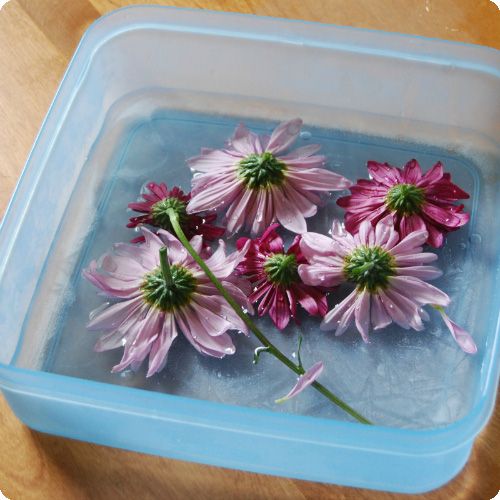 Vervolgens voeg je de bloemen toe als de eerste laag bevroren is. Dit doe je door ze plat te drukken tussen een boek en vervolgens goed aan te drukken op het ijs, zonder dat dit breekt natuurlijk. Zorg ervoor dat de voorkant van de bloem naar beneden gericht is. Besprenkel de bloemen met een klein beetje water en zet het bakje weer in de vriezer. Doordat je het bakje niet direct laat vollopen, zorg je ervoor dat de bloemen zich hechten aan de eerste laag en behoud je eveneens de controle over de plaats waar de bloemen komen.